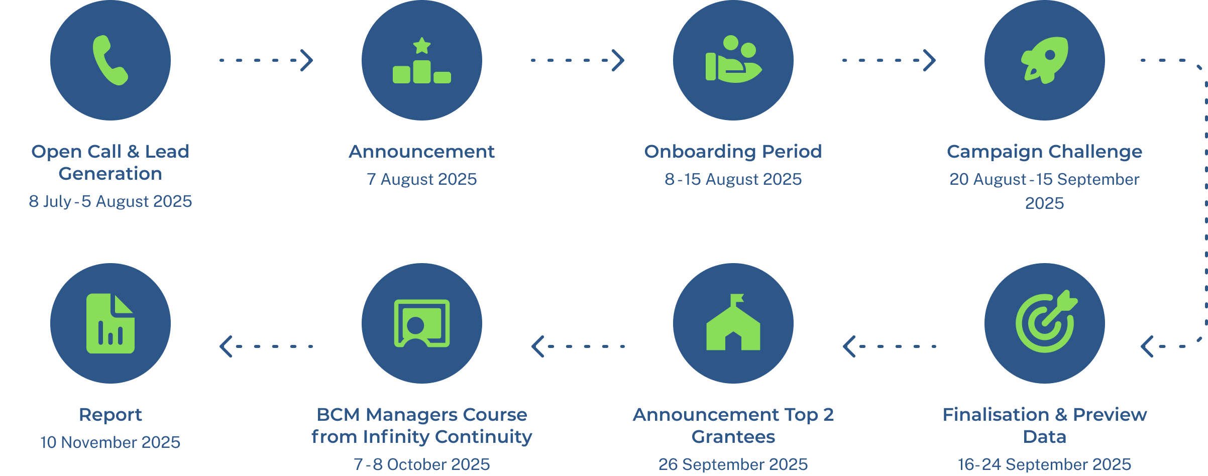 Another key feature is open registration for public-serving organizations such as schools, hospitals, nonprofits, government agencies, community-focused businesses, non-governmental organizations (NGOs), social enterprises, startups, and others. Two organizations will receive fully sponsored seats on the Infinity Continuity BCM Manager Course (normal price: Rp13,000,000). Additionally, all qualified applicants will also receive complimentary seats to join the same course. This social impact initiative increases visibility, relevance, and trust while driving lead conversion.