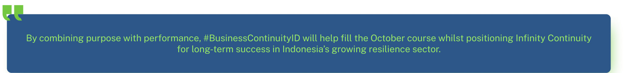 As regulatory and operational risks increase, more Indonesian organisations recognise the need for Business Continuity Management (BCM); yet, access to trusted, practical training remains limited. This campaign aims to generate qualified leads whilst establishing Infinity Continuity as a resilience consultancy firm focussing on business continuity and crisis management